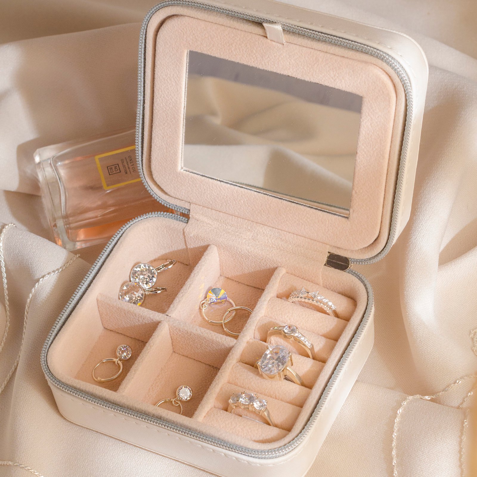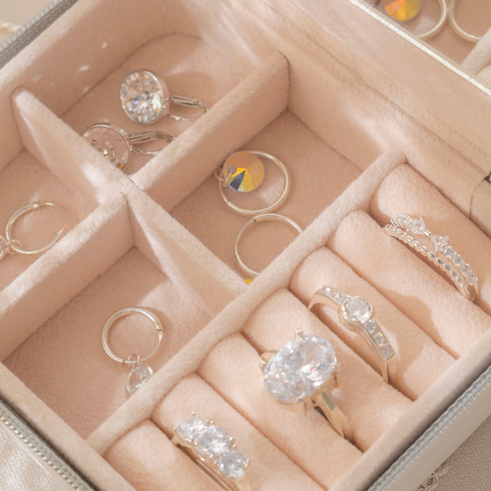 Tiene capacidad para 6 anillos, 12 aros (6 pares) y 4 compartimientos libres, perfectos para guardar dijes, pulseras o cadenas. Su interior está cuidadosamente diseñado para mantener cada joya en su lugar, evitando que se rayen o se enreden.