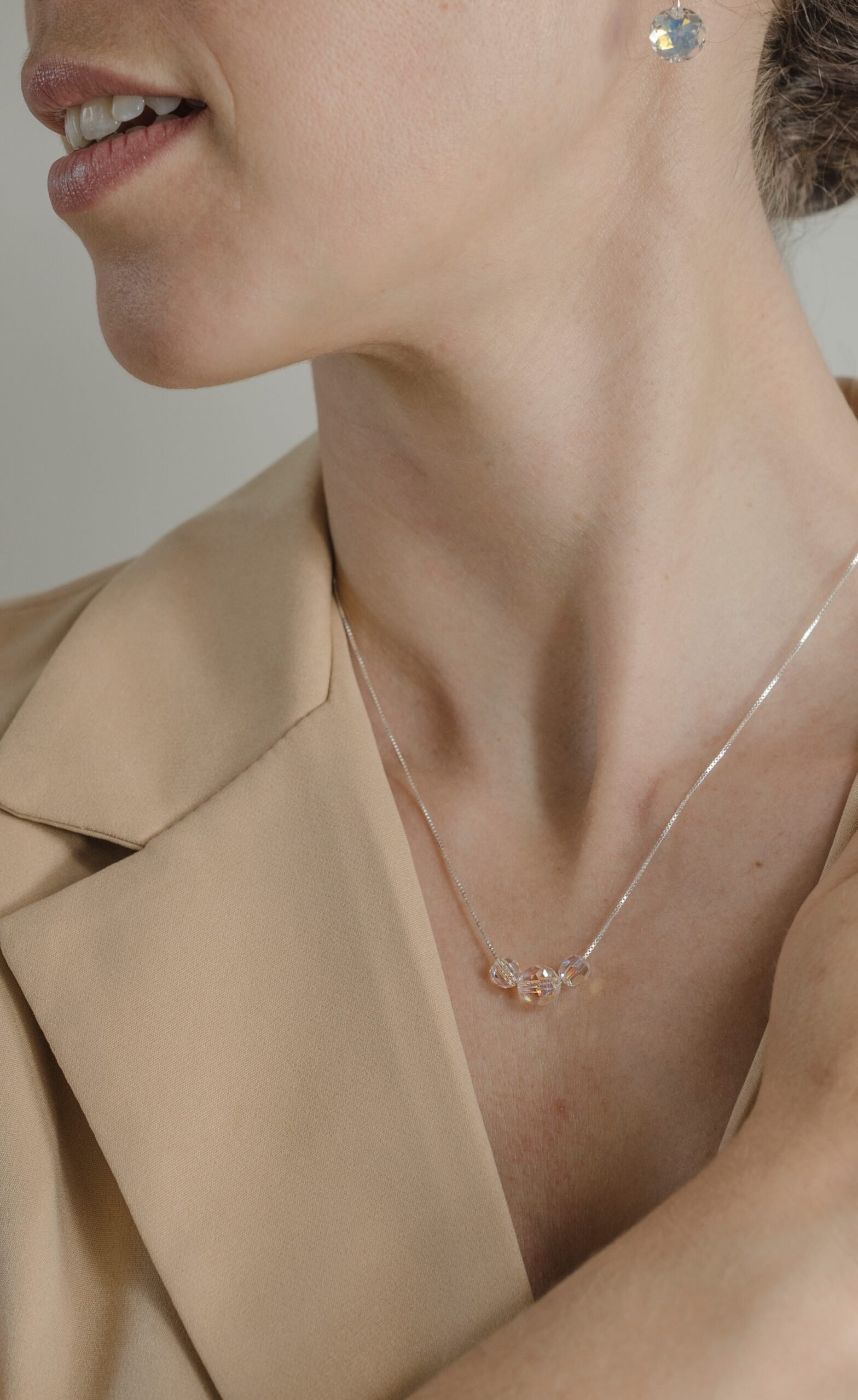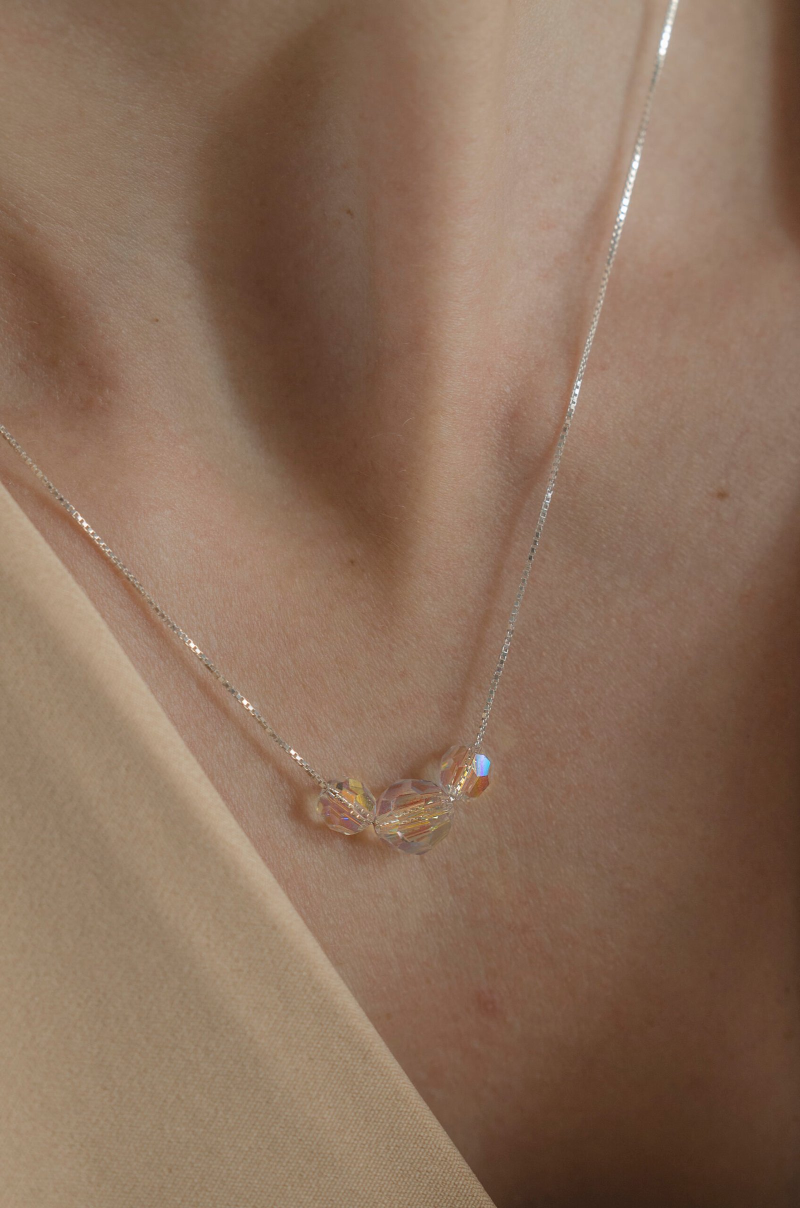 Collar de plata 925 con cristales austríacos. Este diseño combina cristales en formato dona en tono Aurora Boreal que genera destellos llenos de color y luminosidad.
