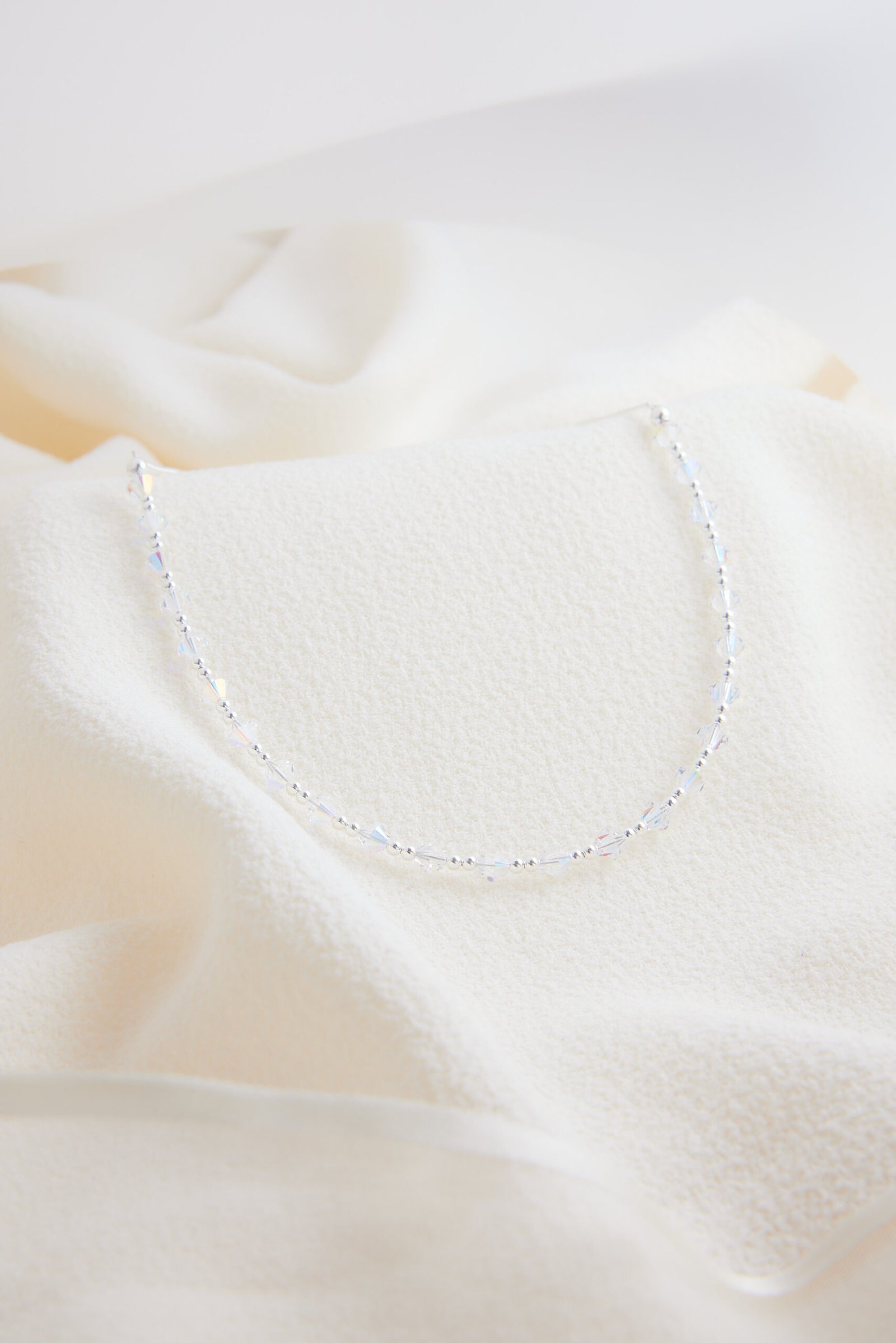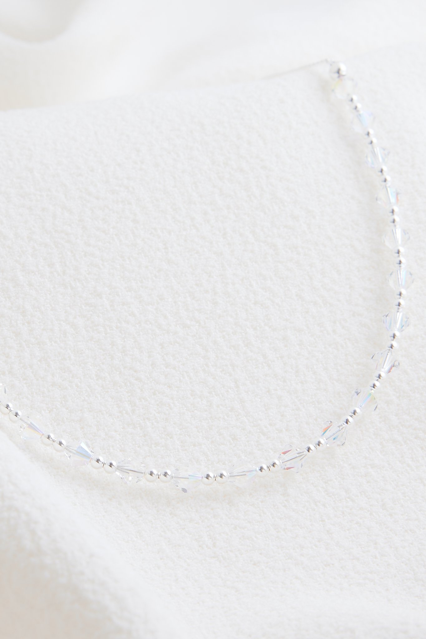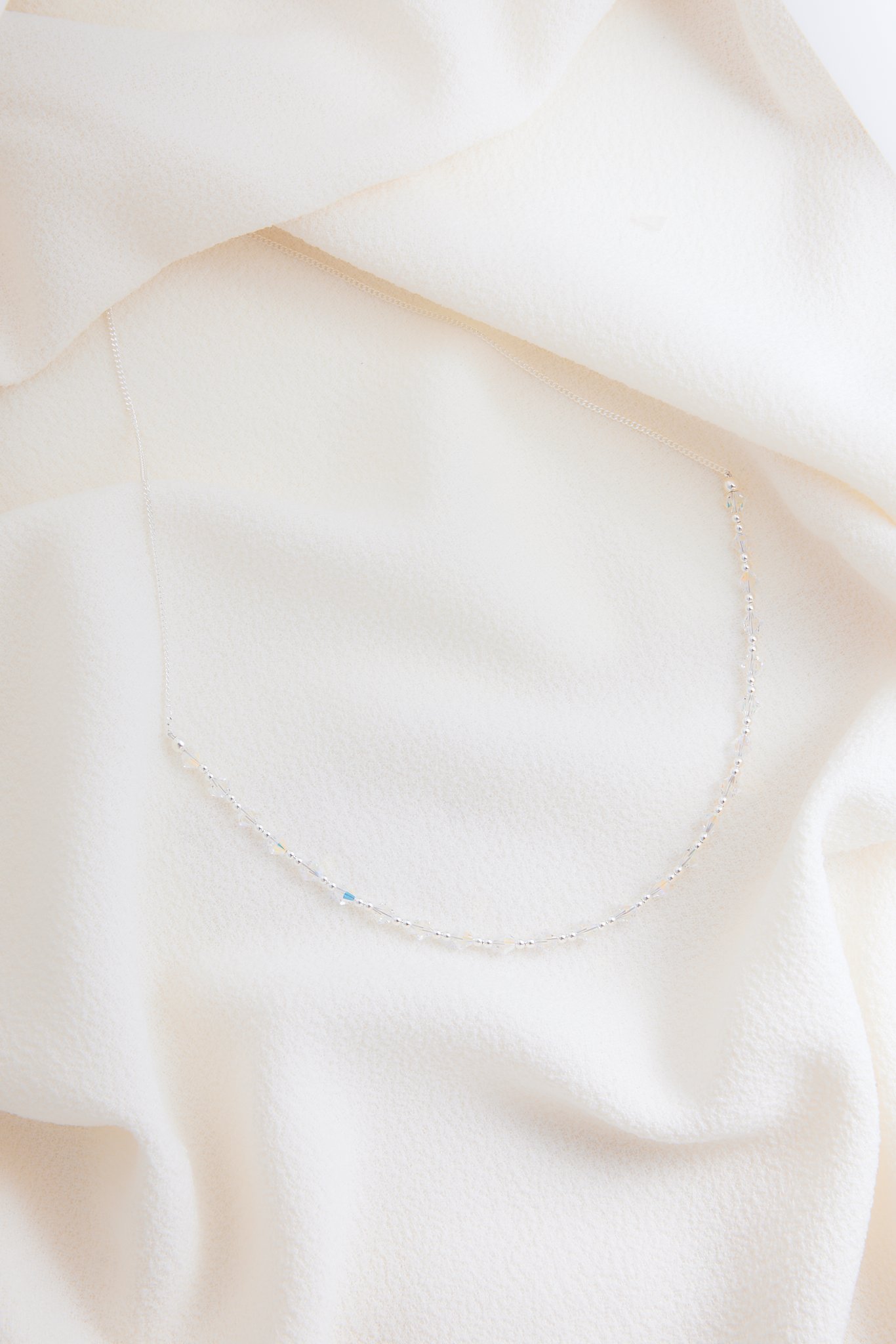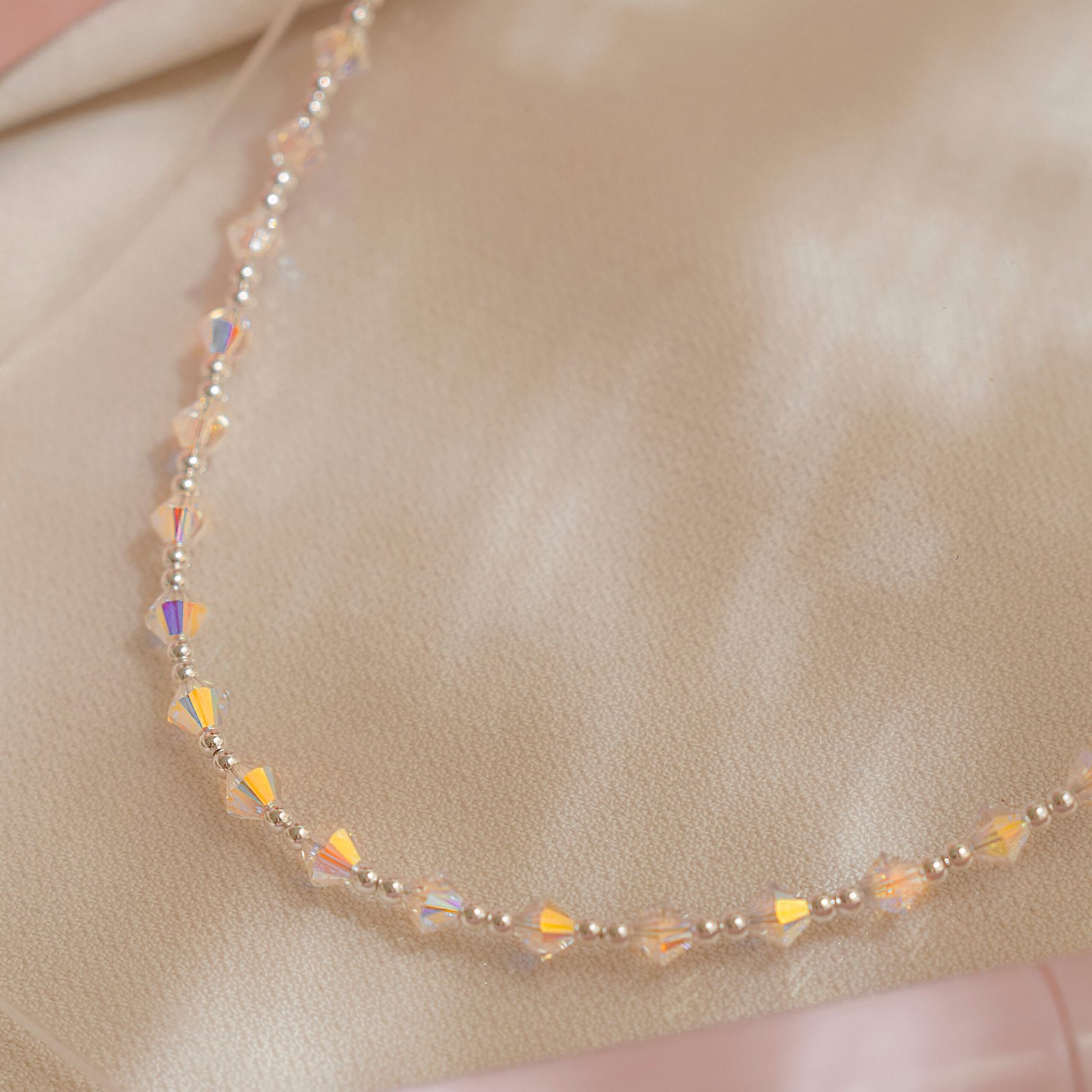 Collar de Plata 925 con cristales austríacos. Uno de los diseños más elegidos gracias a su diseño tan delicado como moderno: combina bolitas de plata intercaladas con cristales en tono Aurora Boreal, creando un efecto de luz y color que resalta a simple vista.